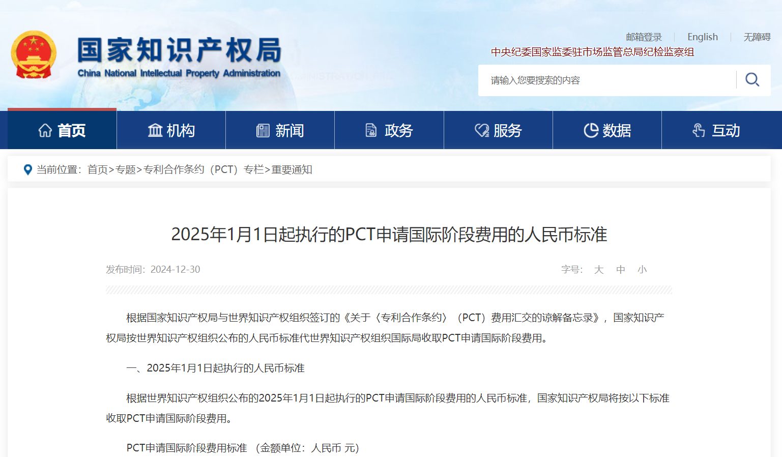 최근 국가지식재산권국은"2025년 1월 1일부터 집행되는 PCT 신청 국제단계 비용의 위안 ...