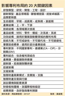 타이완 특허 배치의 척박한 기초와 한계 환경에 처해 있으며, 특히 특허 배치의 방법과 도구를 깊이 연구하고 발전시킬 필요가 있다.특허배치의 방법은 직언하면”권지”로서 발명창작을 주요국가권하의 기술, 제품의 좋은 구역에서 하고”특허못박기”로 전환시켜 소속산업구조에서 기술방안의 우위지위 (positioning) 를 찾고 부동한 국가의 특허 및 그 특허조합으로 전환시킨다.이러한 특허 배치 방법은 타이완의 현재 임의적이고 불연속적인 발명 제안, 1건의 누적 특허 출원과 특허 증서 수의 작법은 크게 다르다.