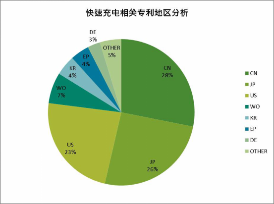 급속충전 기술 관련 특허 중 출원 지역은 주로 중국(CN), 일본(JP), 미국(US), 국제특허출원(WO), 유럽(EP), 한국(KR), 독일(DE)로 중국이 가장 많았고 일본이 그 뒤를 이었다.충전 시간에 대한 소비자의 요구를 보면 전기차 급속충전 기술도 미래 연구의 방향이며, 연구 개발 시 기존 특허 정보를 충분히 활용할 수 있다.