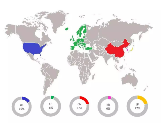 전기차는 일본(JP), 중국(CN), 미국(US), 한국(KR), 유럽(EP), 국제특허출원(WO), 독일(DE) 등 총 60여개 국가 및 지역에 걸쳐 글로벌 특허 배치가 20만건에 달하며, 주로 일본, 중국, 미국, 한국, 유럽 (유럽이 유럽 특허청을 통해 출원한 특허로 유럽 각국에서 출원한 특허는 포함되지 않음) 에 집중돼 있다.총체적으로 말하면 전기자동차특허의 지역분포는 현재 전기자동차의 주요시장분포와 기술집결지역과 비교적 부합된다.각국은 최근 몇 년 동안 특허 배치가 현저하게 증가했다. 일본과 미국은 다른 나라에 비해 기술 발전이 비교적 빠르다. 중국은 초기 특허가 다른 나라에 비해 특허 수량이 적다. 2010년부터 폭발적으로 증가하기 시작했다. 특허 총 수량은 5만 건을 넘었다. 이를 통해 알 수 있듯이 중국은 전기에 기술 축적에서 낙후된 수준에 처했다. 중국 전기 자동차 시장이 열리면서 자국 신청자와 외국 신청자들이 모두 중국에 특허를 배치하여 중국 특허 증가가 뚜렷해졌다.