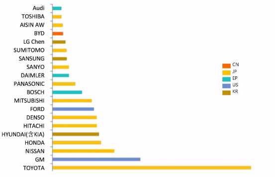 전기차 글로벌 특허 출원인 상위 20개 중 일본 기업이 많고 특허 출원 상위 기업은 대부분 하위 완성차 기업이며 상위 및 중류 모듈러 기업이 소수를 차지한다.특허 출원 건수가 가장 많은 곳은 토요타로 다른 기업을 크게 앞질렀다.중국 기업의 수가 비교적 적고, 중국 기업과 전 세계 업계 선두 기업의 격차가 뚜렷하며, 전기 자동차 특허 연구 개발과 배치에서 중국 기업은 계속 강화되어야 한다.