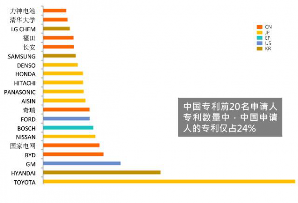 중국이 출원한 특허 중 상위 20개 출원인은 중국 기업과 일본 기업이 주를 이뤘고 이 중 1위는 토요타였으며 다른 기업을 훨씬 앞질렀다.중국 기업 외에 한국, 미국 기업도 중국을 중요한 특허 배치국으로 지정하였는데, 이는 중국 기업에 대한 위협을 크게 증가시켰고, 중국 지역의 특허 리스크가 증가하였으며, 특허 리스크 조사와 회피는 중국 기업에 있어서 특히 중요하다.