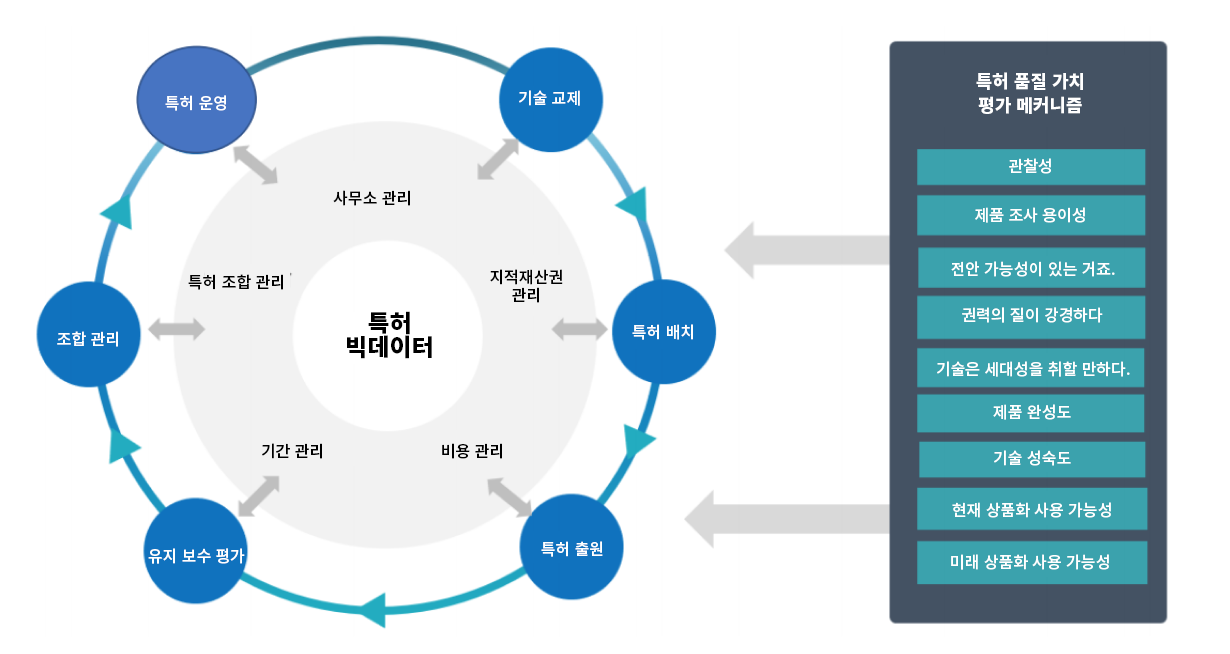 “자산 운영 관리”서비스와 함께 기술 자산 운영 시스템 및 특허 데이터 플랫폼을 통해 전체 지적 재산권 데이터를 완전하게 수집하고 누적하여 시각화된 대시보드로 사용자의 빠른 의사 결정을 보조하고 이기는 전술과 전략을 구축할 수 있습니다.