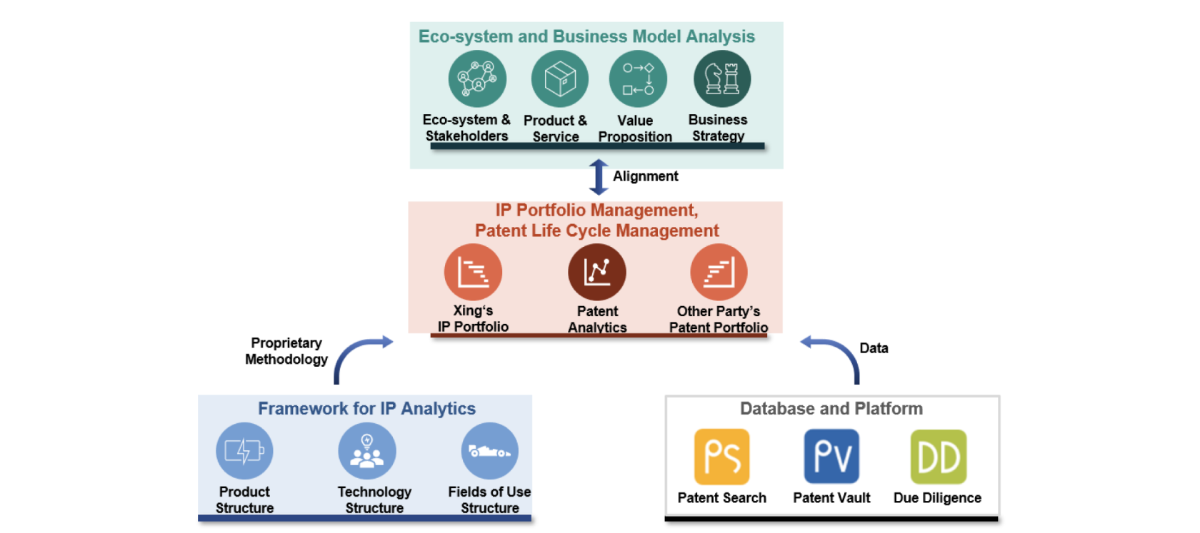 고객 및 산업 지식재산권 상황을 분석하고 비즈니스 모델과 운영 목표를 결합하여 지식재산권 자산관리(IPPM)와 특허 생명주기 관리(PLCM) 등 방법론을 통해 고객 지식재산권 발전 전략과 각종 관리 제도 체계를 제정한다.