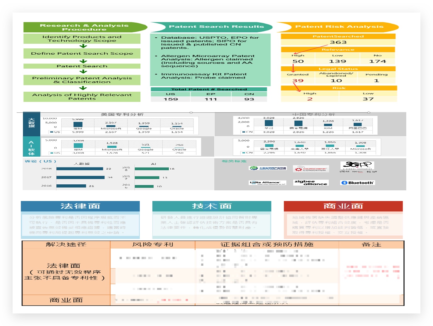 운영의 자유 분석 (FTO) 을 통해 위협과 기회의 소재를 명확히 하고, 대응 전략과 해결 방안을 제시하며, 특허 위험을 적절히 처리하고, 기업 제품의 사용, 제조, 판매, 수출입이 순조롭게 진행되도록 보장하며, 나아가 운영의 자유를 확보한다.